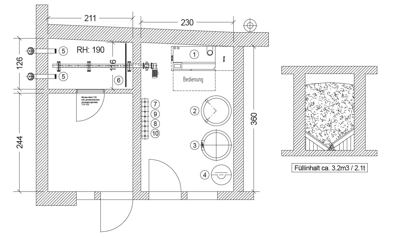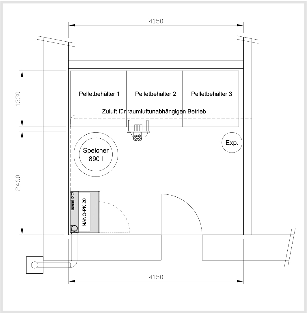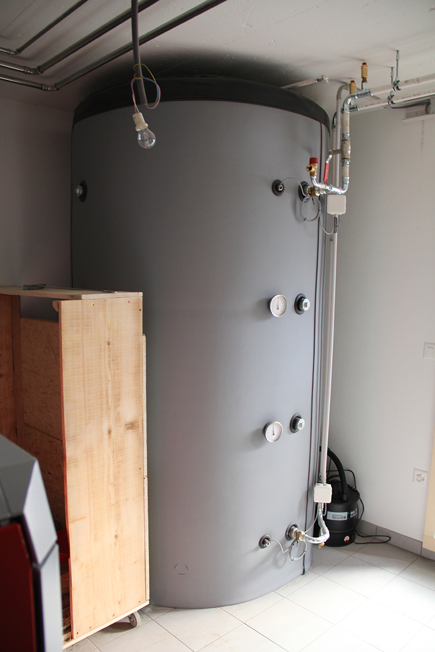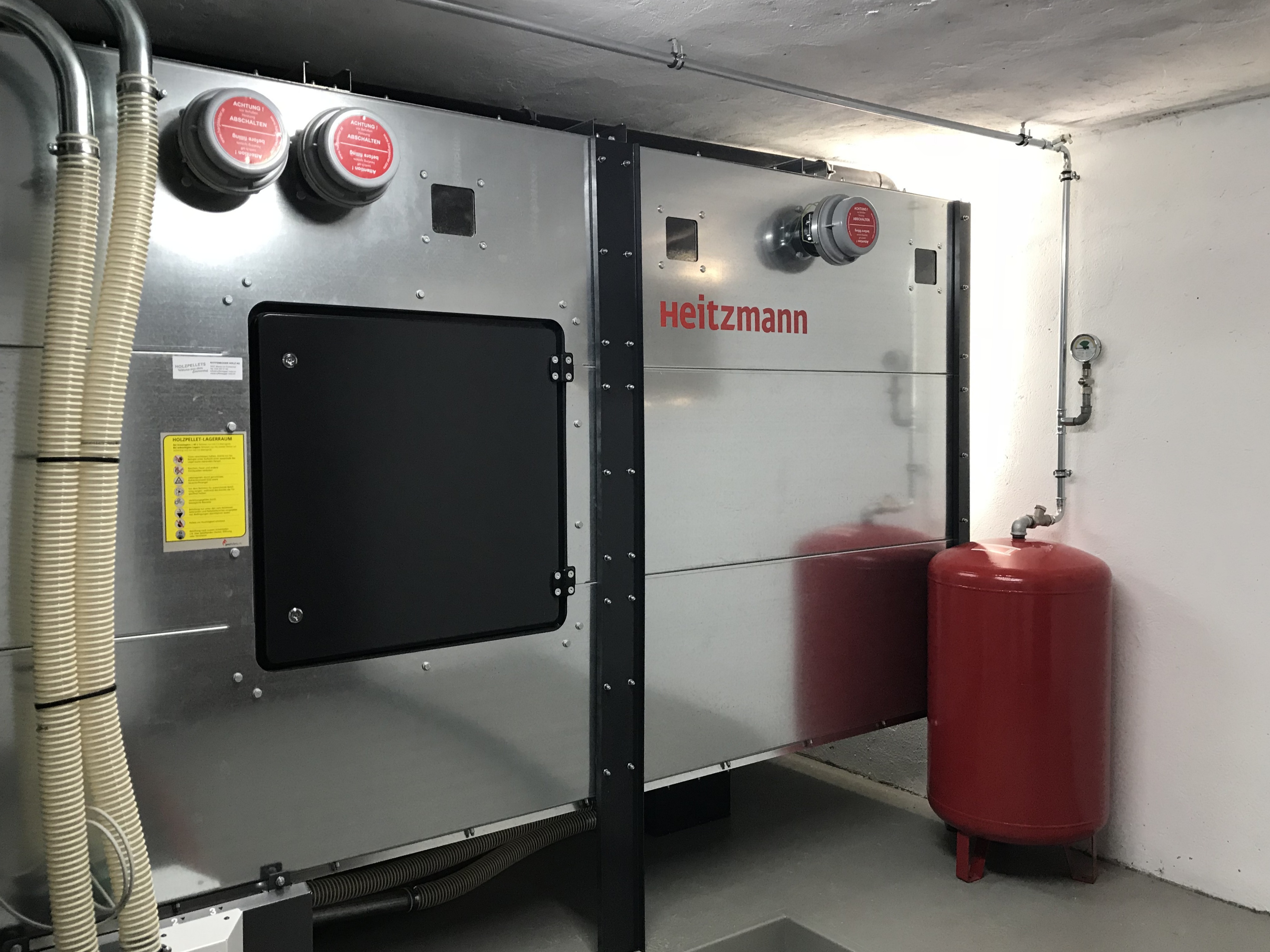 Ein Ziel der Besitzer war es, ohne bauliche Veränderungen im Heizraum möglichst viele Pellets zu lagern. Sie haben sich für eine Lösung mit drei massgefertigten Pellettanks aus Metall entschieden. Die Behälter finden neben der Heizung Platz und können mit seinem Fassungsvermögen von 5 Tonnen den Pelletbedarf für eine ganze Heizsaison lagern.