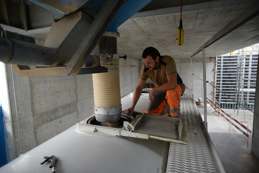 Bei der Befüllung des Lagers entsteht ein Überdruck im Lager. Dieser wird durch einen Ventilator ausgeglichen. Der Staubsack am Ventilator verhindert den Austritt von Staub in die Luft.