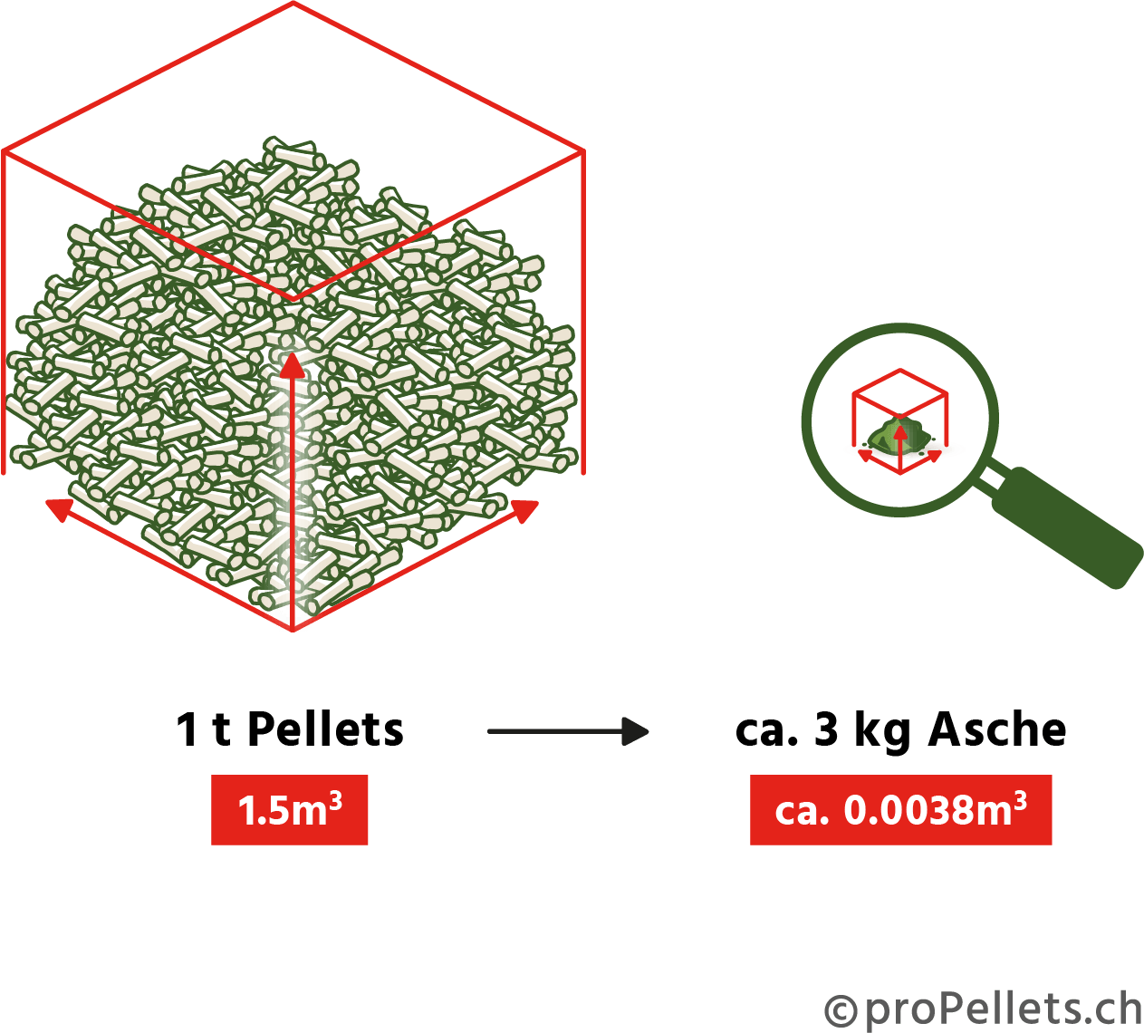 Gemäss der gültigen Norm für Pellets (SN EN ISO 17255-2) dürfen Pellets der Qualitätsklasse A1 einen maximalen Aschegehalt von 0.7% aufweisen. Aus Prüfberichten von Pellets die für die ENplus®-Zertifizierung kontrolliert wurden, ist bekannt, dass der gemessene Aschegehalt zwischen 0.2 und 0.4% liegt. Das heisst also, beim Verbrennen von 1 Tonne (entspricht 1.5 m3) Pellets entstehen 2-4 kg Asche.