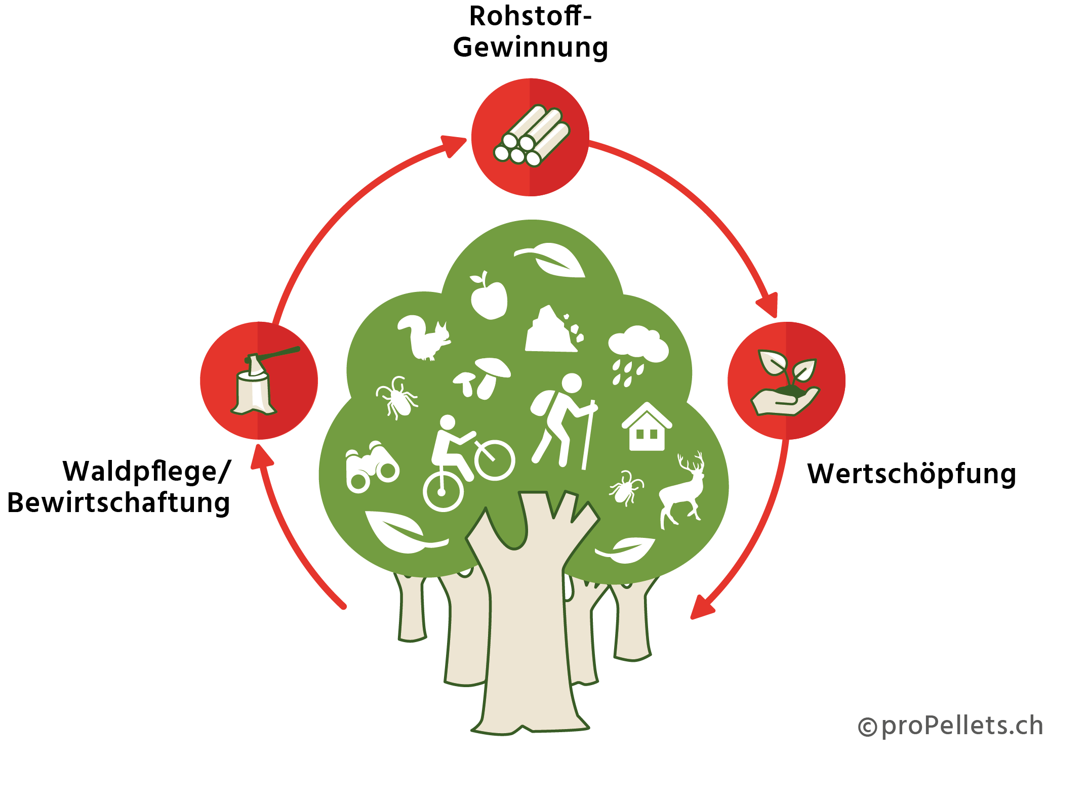 Der Schweizer Wald erfüllt vielfältige Funktionen. Schutzwälder schützen zum Beispiel vor Lawinen, Stadtwälder sind Naherholungsgebiete. Für Bauern und für die Holzwirtschaft ist der Wald ein Rohstofflieferant. Damit der Wald seine Funktionen erfüllen kann, muss er gepflegt werden. Das Waldgesetz schreibt eine nachhaltige Waldpflege vor, bei der die Waldfläche erhalten bleibt.