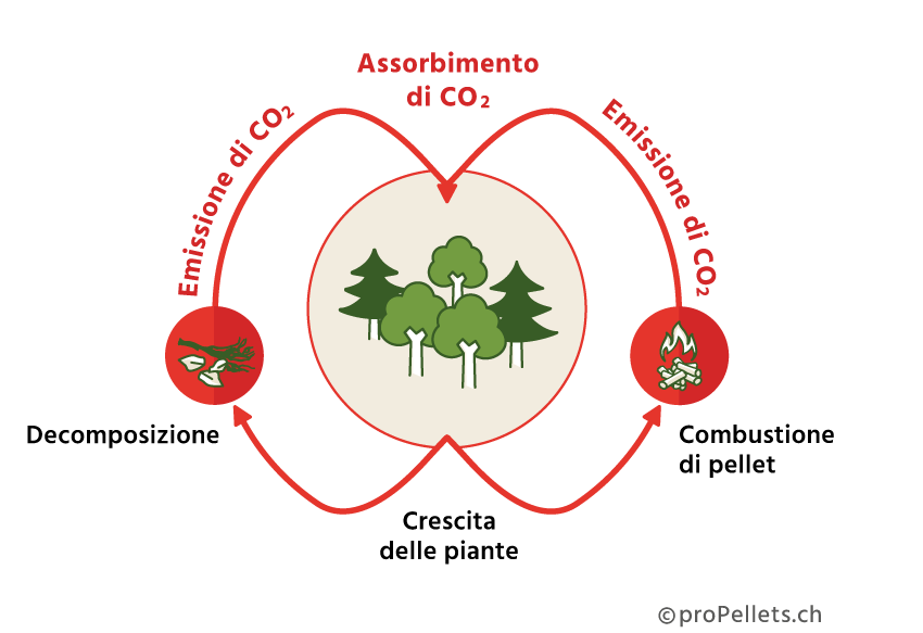 I riscaldamenti a pellet sono ottimi sotto il profilo della protezione del clima: la combustione del legno libera infatti una quantità di CO2 solo pari a quella assorbita dall’albero durante la sua crescita.