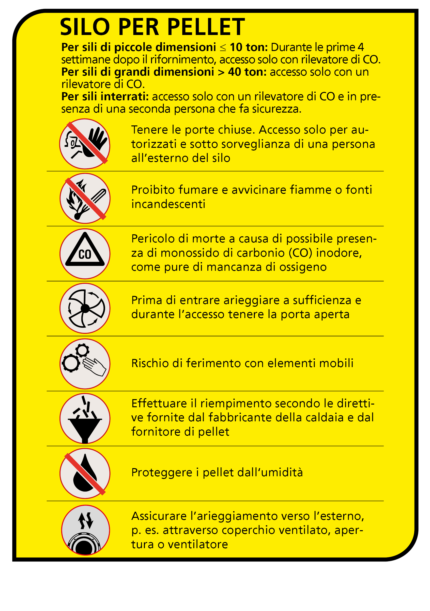 In linea di principio vale la regola secondo cui può accedere ai depositi di stoccaggio del pellet solo personale qualificato. Una seconda persona deve rimanere al di fuori del deposito e mantenere il contatto visivo con la persona all’interno per poter allarmare i soccorsi in caso di emergenza.